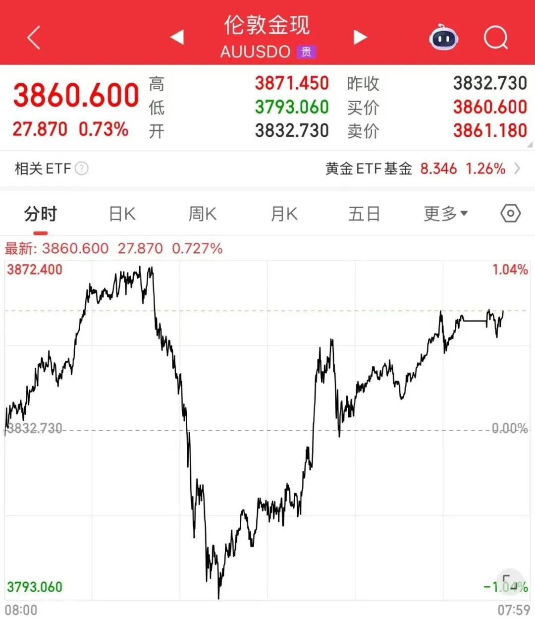 9月30日,伦敦现货黄金价格盘中最高冲到3871.45美元/盎司,突破了9月29日3834美元/盎司的前高,再创历史新高。不过,当日A股收盘之后,市场大幅波动,截至发稿,伦敦现货黄金价格上涨0.73%,报3860.6美元/盎司。
